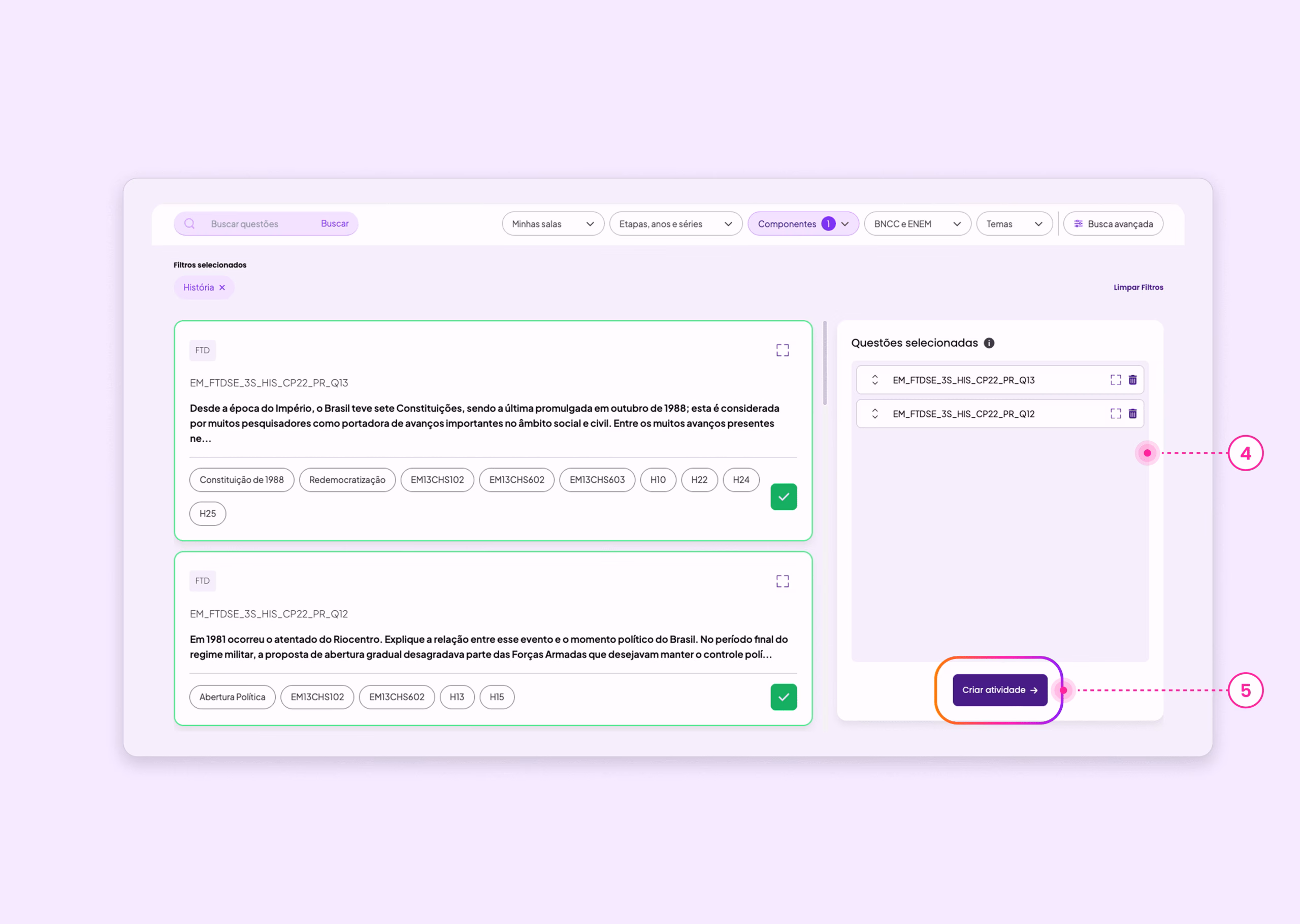 5. Ao finalizar a seleção, selecionar o botão Criar atividade para montar a atividade com as questões escolhidas.